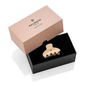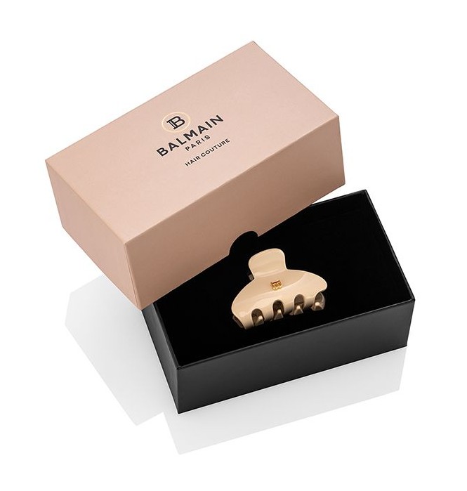 Väike käsitööna valminud klamber vastupidavast tselluloosatsetaadist, millel on Balmainile omane 14-karaadine kullatud „B” logo.