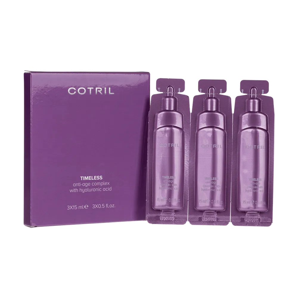 Cotril Timeless seerumikompleks on rikastatud hüaluroonhappe, keratiini ja antioksüdantidega. Hüaluroonhape niisutab ja taastab juuste niiskustasakaalu, keratiin tugevdab juuksekiudu ning antioksüdandid aitavad kaitsta juukseid keskkonnamõjude ja enneaegse vananemise eest.